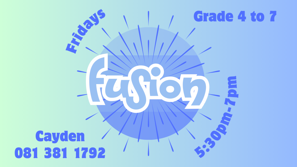 Our Jam and Fusion kids ministry happens each Friday evening at 17:30 to 19:00.